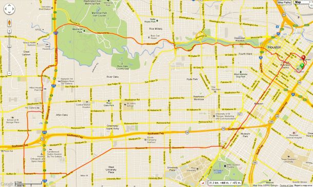 I rolled away from the start line with plastic bags taped around my Mizunos. In the company of wizards, witches, gorillas, bananas, hot dogs and other assorted characters. I didn’t cut the most stylish figure that night. But my feet didn’t freeze, even during that last cold stretch along Buffalo Bayou.