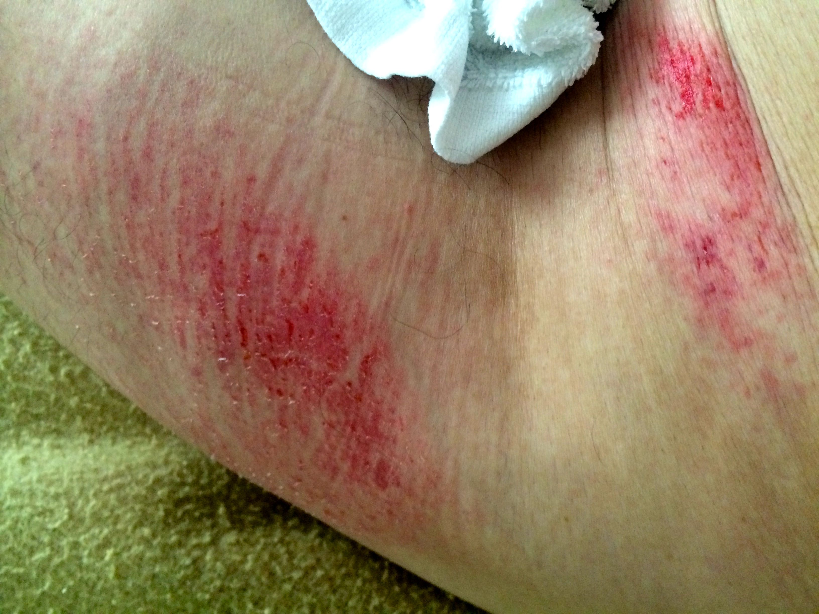 Once I got over the initial shock I checked for damage. Â I had a grazed left knee, a long graze on my left hand, a graze on the point of my left hip, a rapidly swelling bruise on my upper left thigh, a small cut on my left eye brow, scratches on both palms, and a long graze on my right forearm below the elbow.