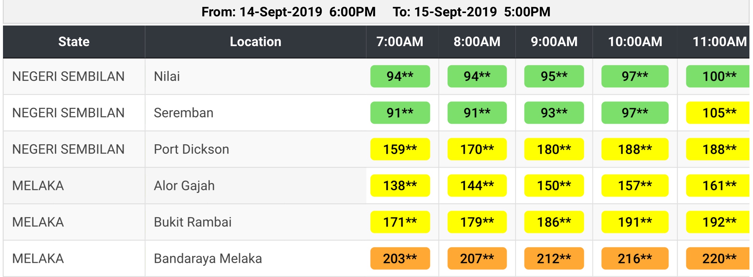 It was a prescient decision to shorten the ride. As you can see from the readings below the API for Port Dickson and cities in Melaka got worse and worse as the morning progressed. The API for Seremban nudged up at a slower rate but still was above 100 at 11.00am. The shortened route got us back to Paroi at 11.15am so we were done riding before the haze got bad.