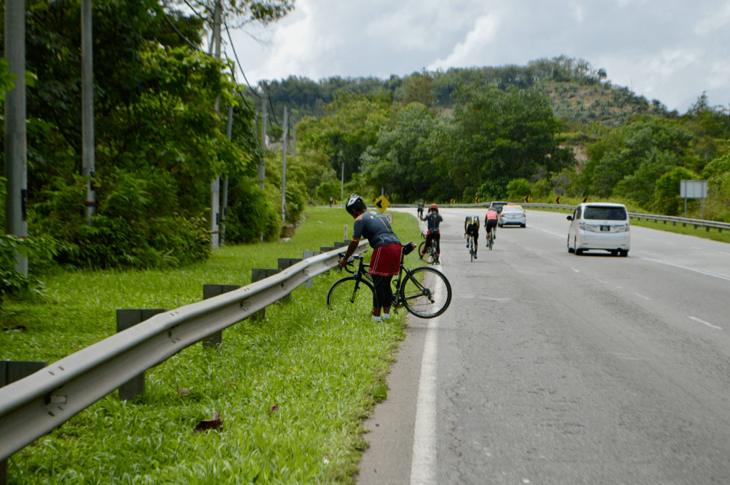 The wet weather put some people off. Twenty-three cyclists had turned up at Kota Warisan. As well as several friends on scooters and motorbikes. They had volunteered to be our outriders. All of us were wondering if we would ride, or just stay put and order more teh tarik, nasi lemak and roti canai.