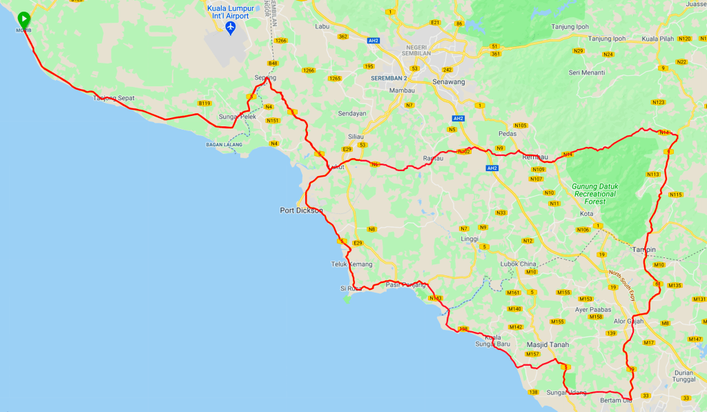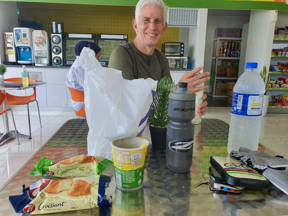 At 30km, we stopped at a Petron station to refill our bottles. At 63km we did the same at a Bestari Mart. The lady at the counter there was intrigued by a Mat Salleh speaking Bahasa. I gave her a short biography in response to all her questions.