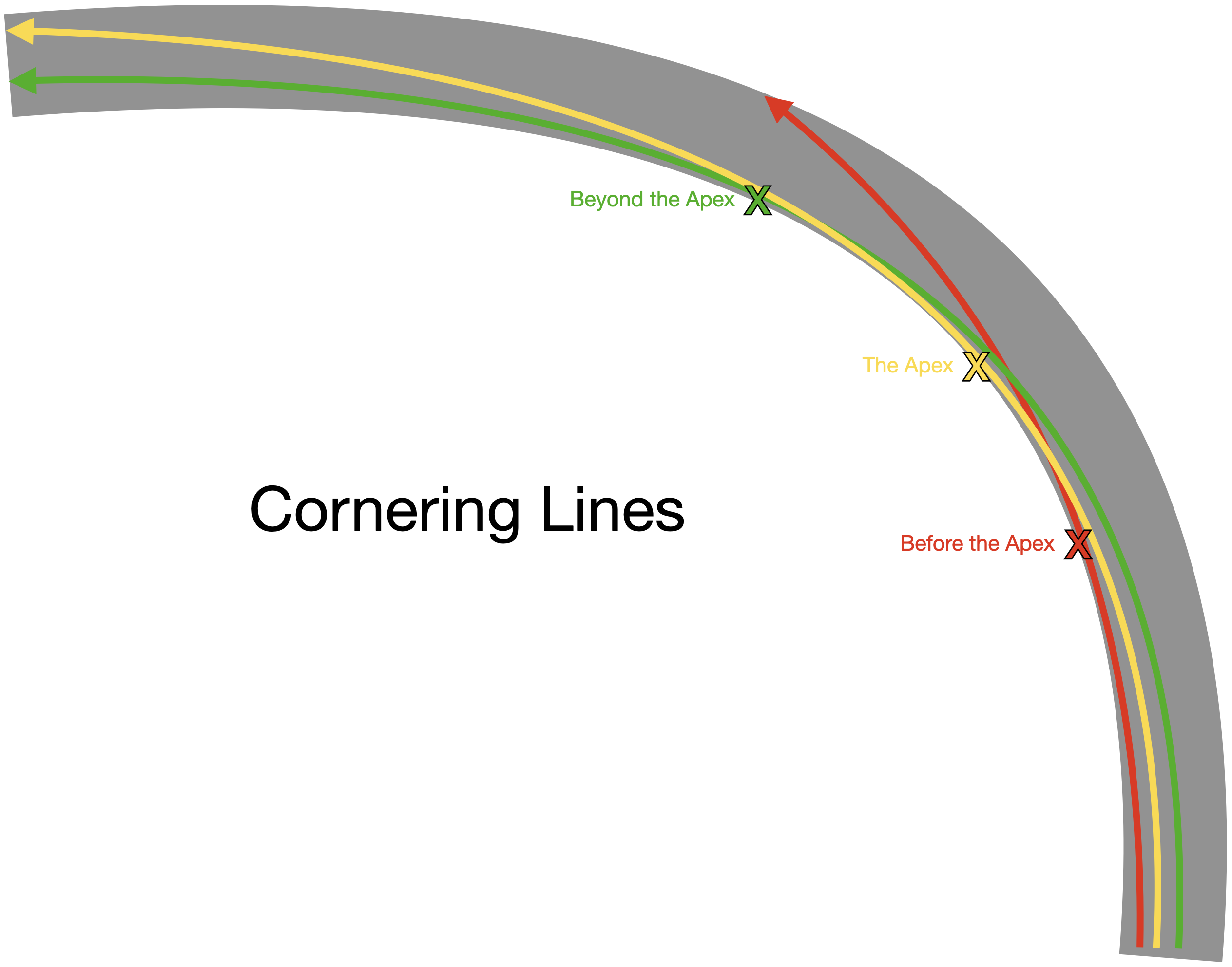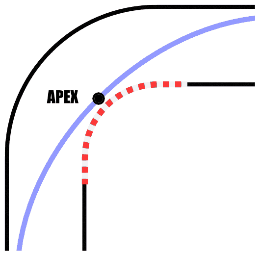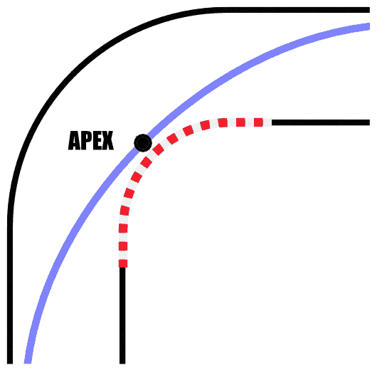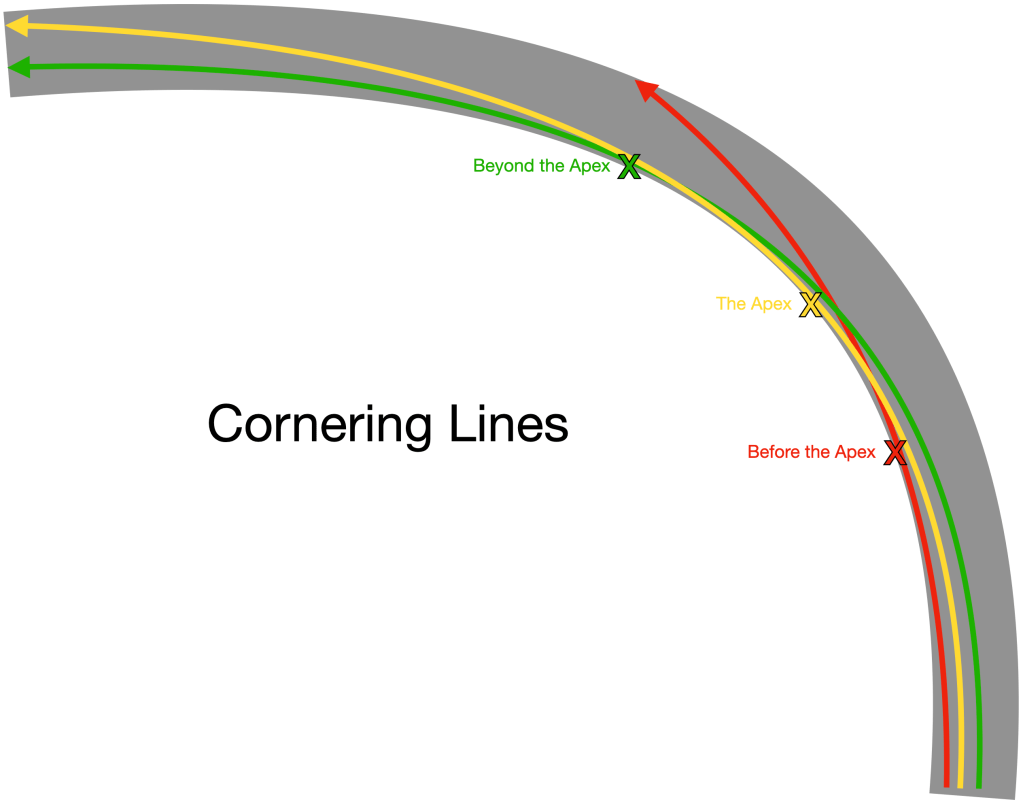 Another factor that may contribute to crashes on corners is the cornering line. The cornering line is the path taken around a particular curve. For any given corner, there is an infinite number of possible cornering lines. There is also an infinite number of possible cornering lines which do not make the curve. The apex refers to the “peak” of the cornering line located at the centre of the corner.