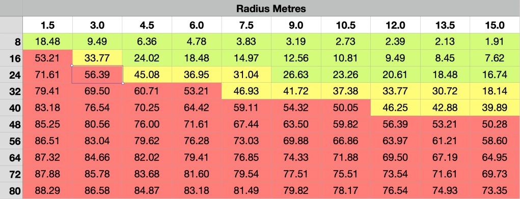 Red is in the No Go range. Taking a 7.5-metre radius turn at 48 kph or faster guarantees a skid and a crash.