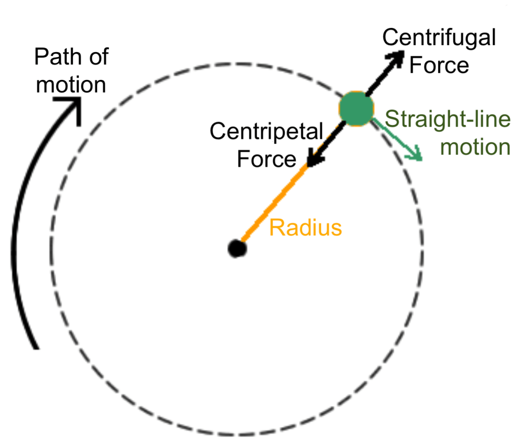 From Newton’s Laws, we know the inertial tendency of an object is to continue forward in a straight line (the blue arrow) unless acted upon by external forces. So a cyclist must apply a force to the bicycle to make it turn. The force making the bicycle deviate from its straight-line path to a curved path (the red arrow) is called the Centripetal Force (the green arrow).