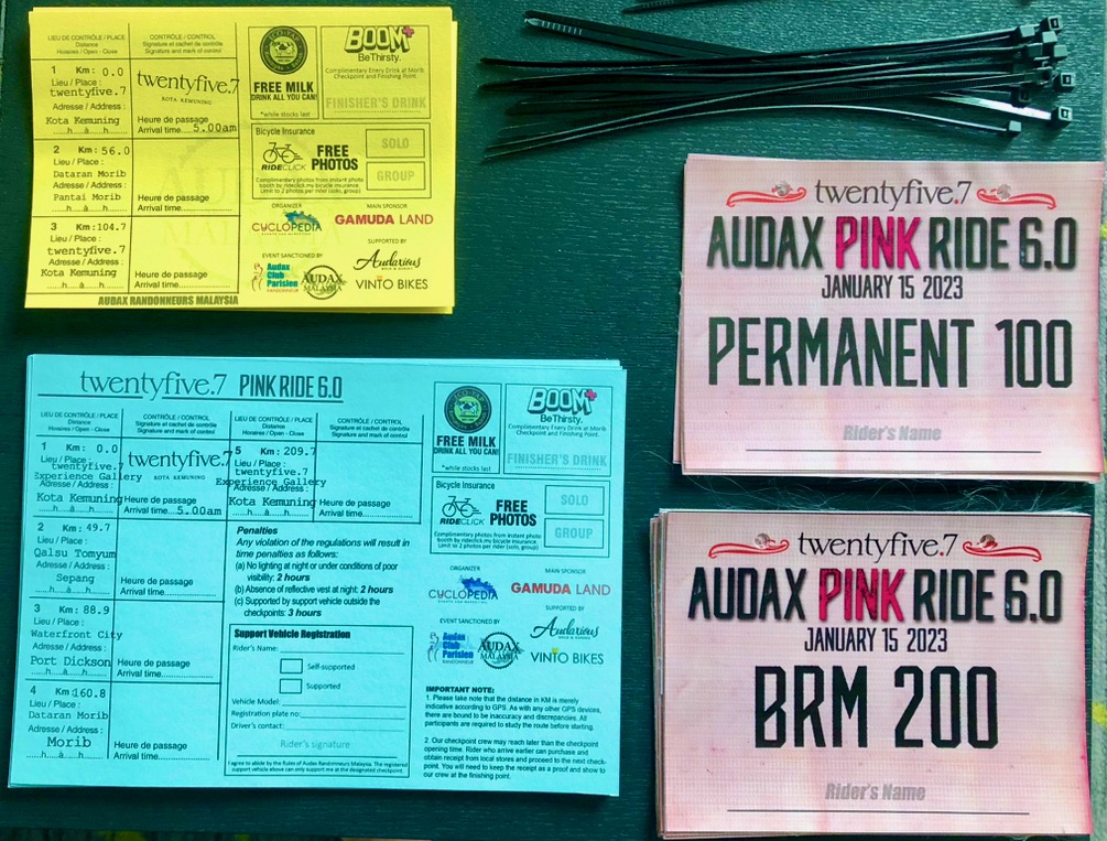 The brevet cards get stamped at each checkpoint along the route. The bike tags identify differentiate registered participants from unregistered ones, known locally as “ghost” riders.