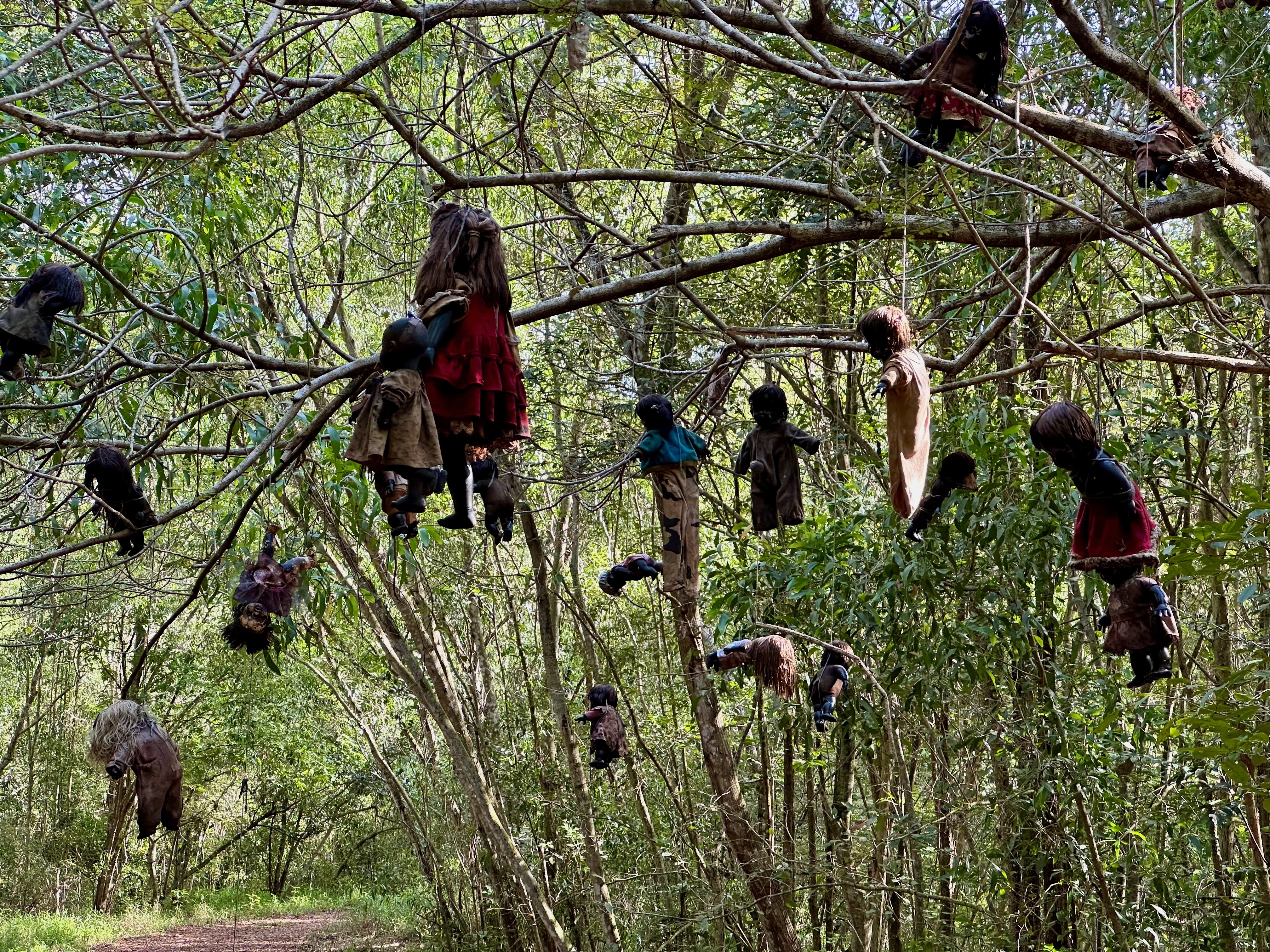We went up there anyway. To be greeted by quite a frightening sight. Dozens of dolls looking like Chucky from the horror film series “Child’s Play” were hanging from branches over the road.