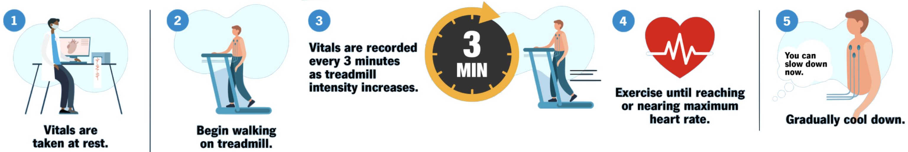 These checkups included a cardiac stress test. This test helps determine how well your heart responds to physical exertion. The patient is connected to an electrocardiogram (ECG) machine, a blood oxygen level monitor, and a blood pressure cuff. The test starts on a treadmill at a walking pace. The speed and grade of the treadmill increase as the test continues. Vital signs are recorded every three minutes. The test ends when the patient reaches a calculated maximum heart rate or cannot continue because of fatigue, shortness of breath, etc.