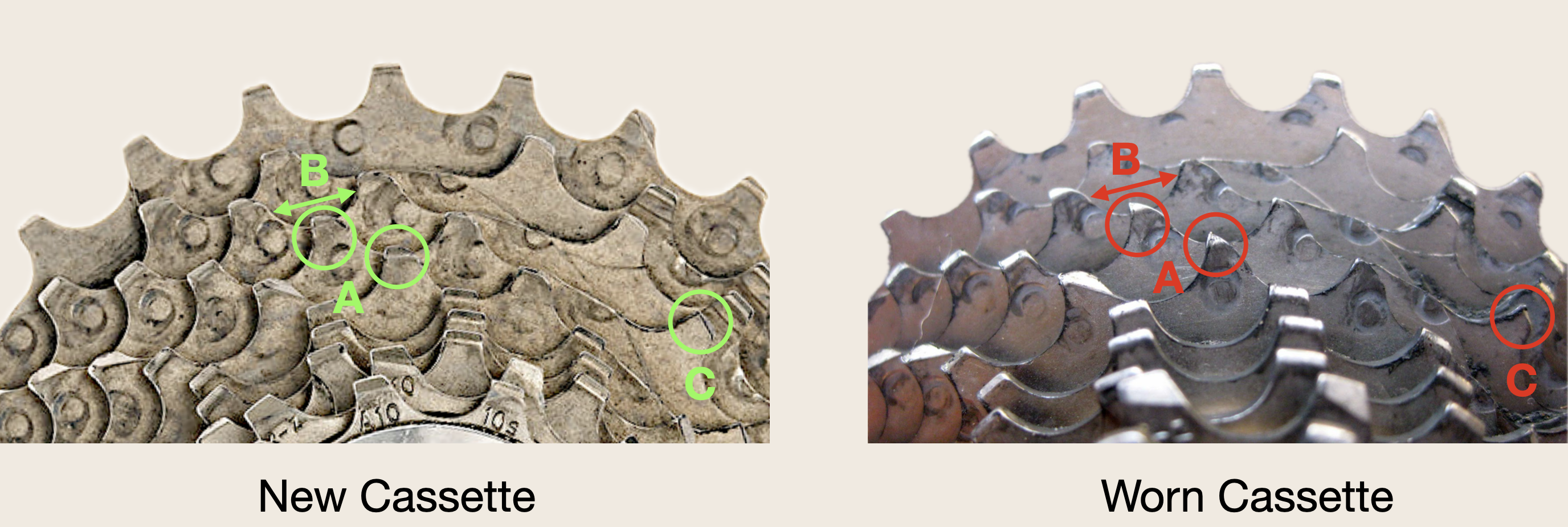 The two teeth in the green circles labelled A show a normal tooth profile. The red circles labelled A on the right show a phenomenon called “Shark Finning,” where the leading edge of a cog tooth curves inwards, making it resemble a shark’s dorsal fin. In time, this erodes the top of the tooth and causes the chain to skip.