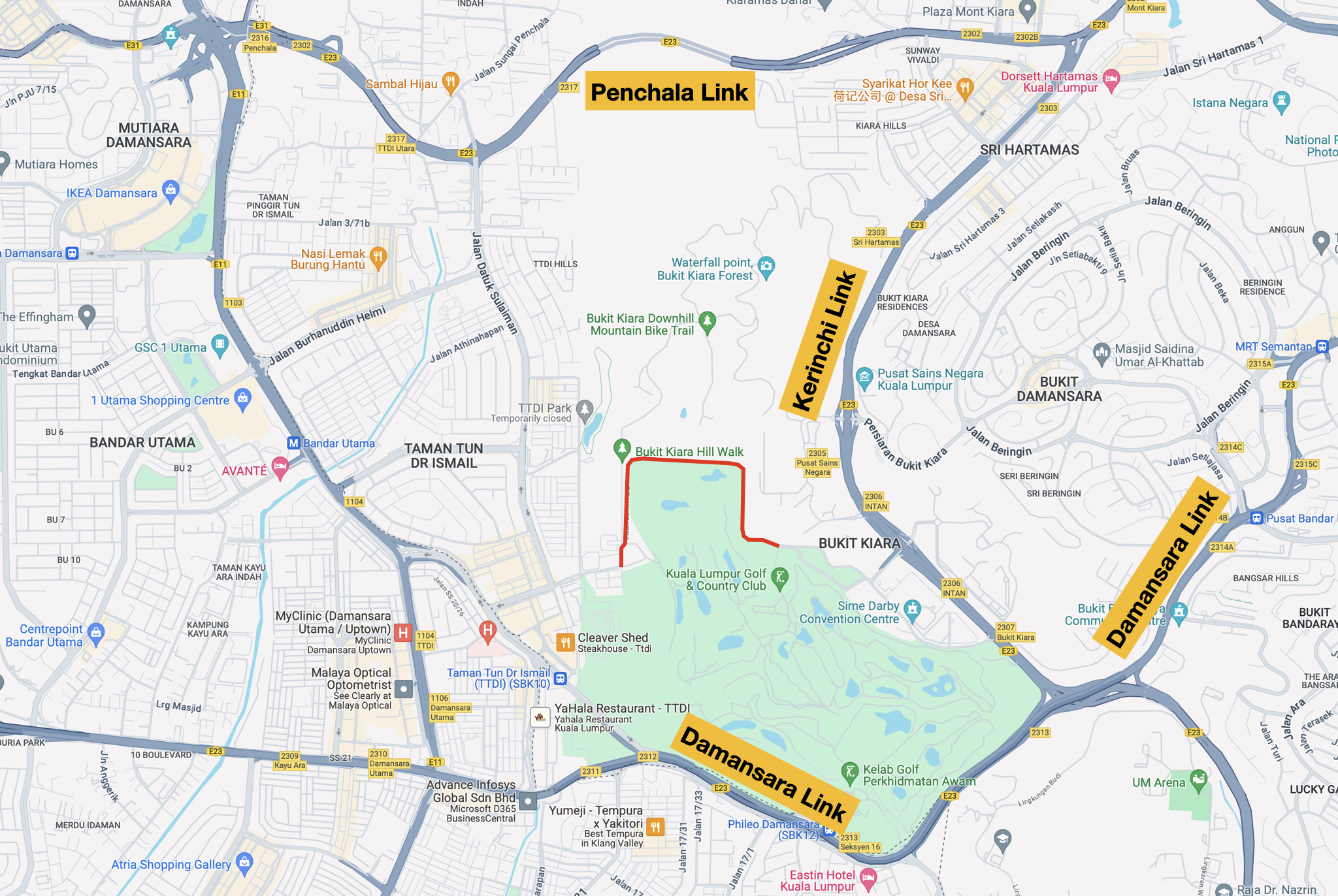 I don’t have to go far from home to find a hill. Bukit Damansara is 6 km (4 mi) west of Anggun Residences. I climb 80 m (262 ft) to get there. Higher climbs lie to the east. Anything from 158 m (518 ft) above sea level to 500 m (1,640 ft) above sea level.
