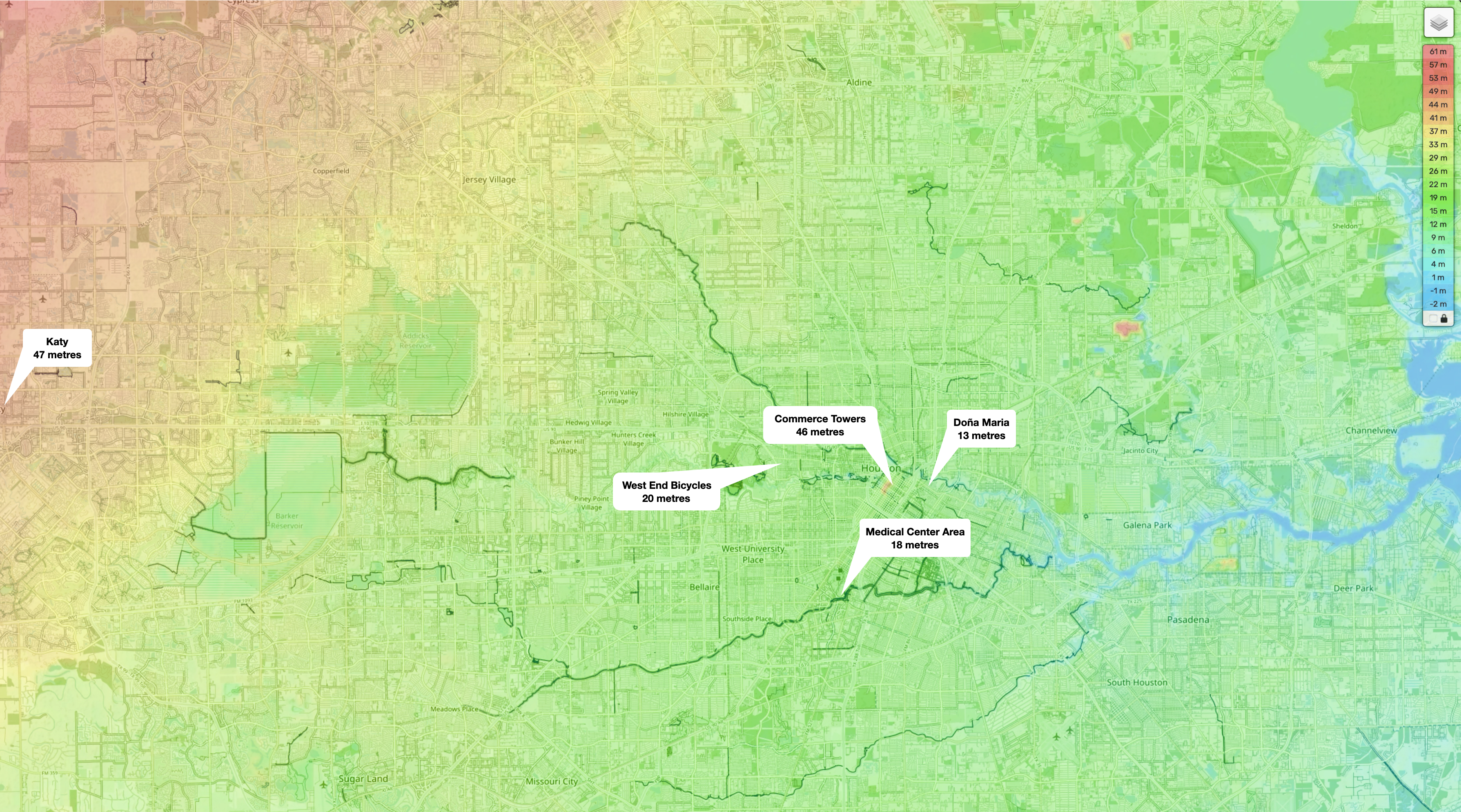 This topographic map shows just how flat Houston and the surrounding area are. I hadn’t realised that Commerce Towers, where I lived in Houston, is in the highest part of the city, at 46 m (151 ft) above sea level. It is downhill from there to West End Bicycles where my group rides started. Doña Maria, our Sunday destination for breakfast tacos, is even lower.