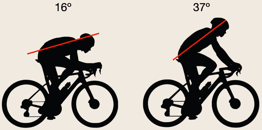 Most recreational cyclists need a bicycle that allows them to adopt a more upright back angle than professional cyclists exhibit. In many cases, at least double the back angle. A taller frame stack and a shorter frame reach allow for a more upright position.