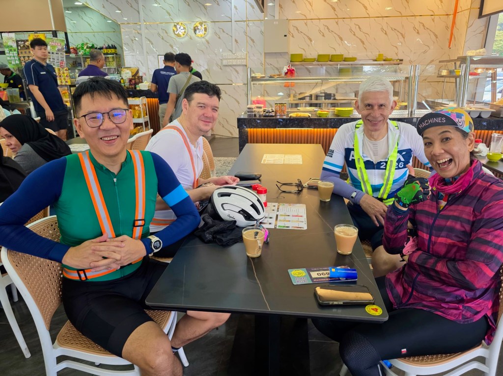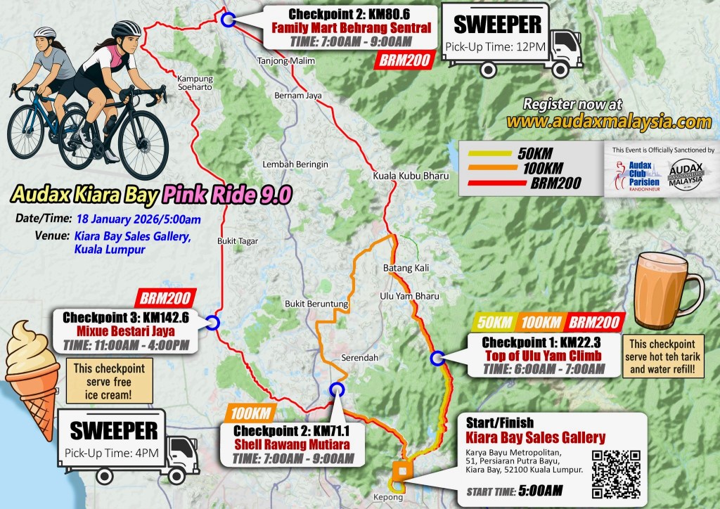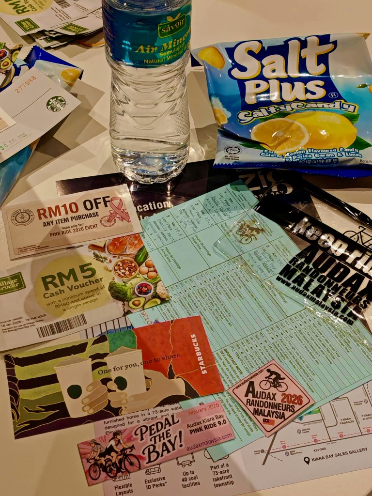 This Pink Ride was promoted as a good introduction to self-supported long-distance rides. A key provision was a Sweeper truck service. A first for an Audax Malaysia ride. An array of sponsors lined up to provide teh tarik, Mixue ice cream, AminoVital energy gels, and water at various points along the route.