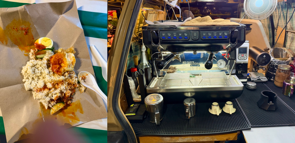 V and I arrived at about 4:15 am. We were pleasantly surprised to see a nasi lemak stall and a coffee van already open for business. Breakfast sorted!