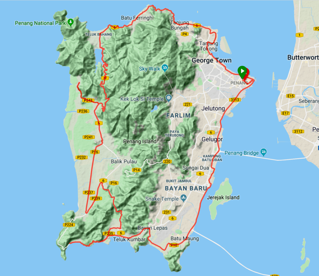 This year the ride had a new name. Toward Cycling City Penang. And the distance was extended to 100km / 62mi. The two out-and-back stretches at the lower left and middle left of the route accounted for the additional 20km.