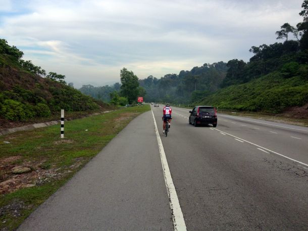 It was light when we pushed off toward Checkpoint 2 in Sungai Besar. There had been some rolling terrain between Rawang and Tanjong Malim. After we made the left turn at Behrang we hit some steeper hills. That was the last climbing of any consequence until we got to the Dragon’s Back climbs at the very end of the ride.