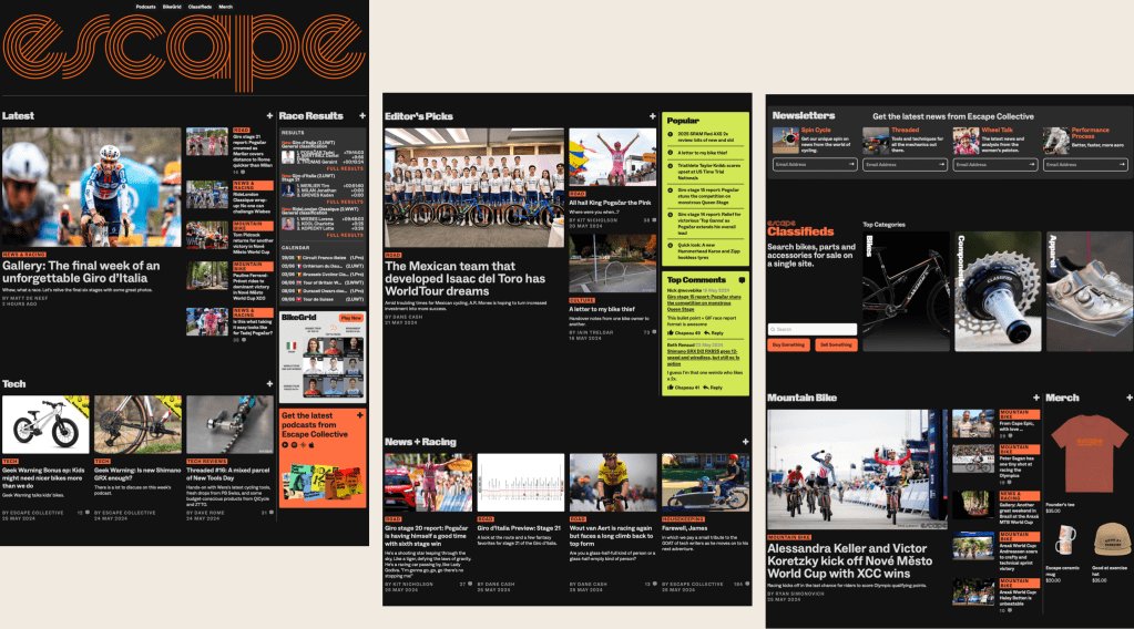 I think Escape Collective is exceptional in the online cycling space. This is a screenshot of today’s Escape Collective website as seen in Safari on an Apple iMac: