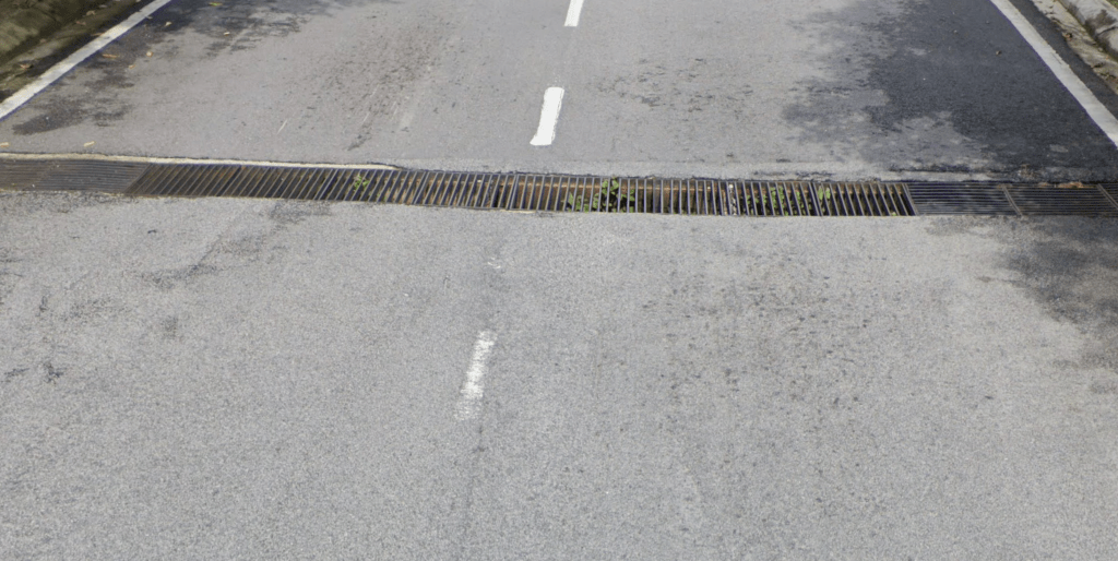 These are on Jalan Tiara Kemensah 3. There are gratings on the edges of the road that are aligned in the non-wheel grabbing direction, but I didn’t notice those the first time I came down this road. I was able to bunny hop over the gratings. I’ve seen accidents where front wheels got caught in gratings like these, with damage to both bike and rider.