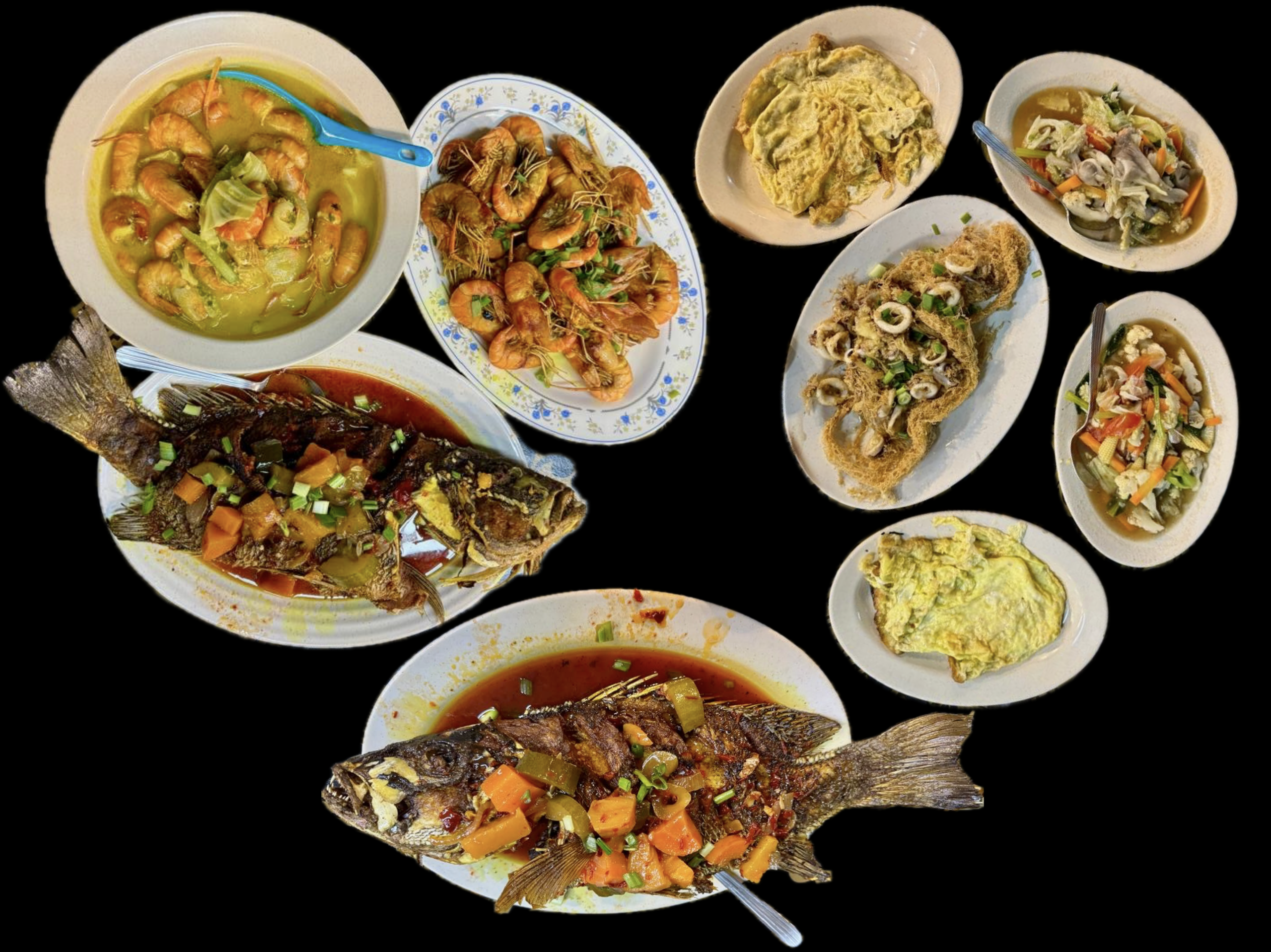 Our food had been pre-ordered. Two udang galah dishes, sweet and sour fish, fried squid, omelette and mixed fried vegetables.