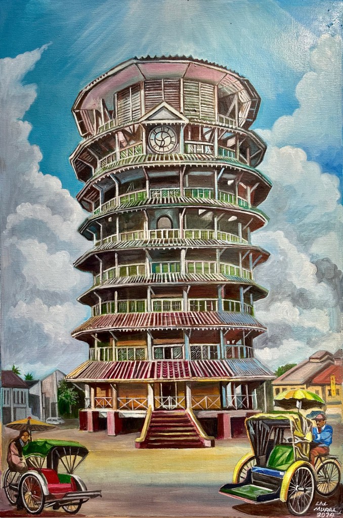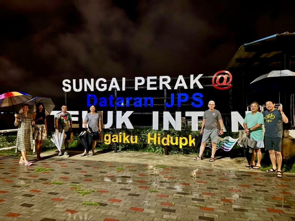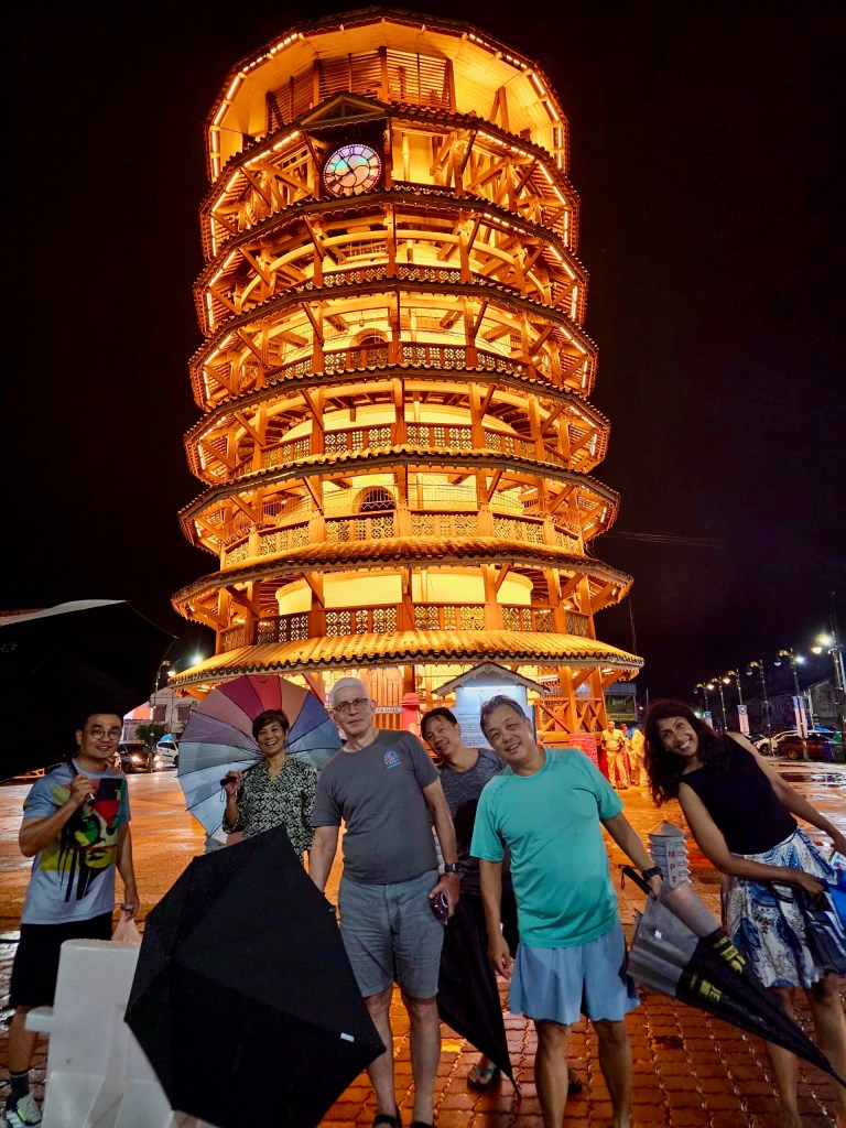 The rain was still falling after we finished eating. We grabbed umbrellas from the car, took this photograph on the bank of the Perak River, and walked through the night market to Teluk Intan’s landmark building.