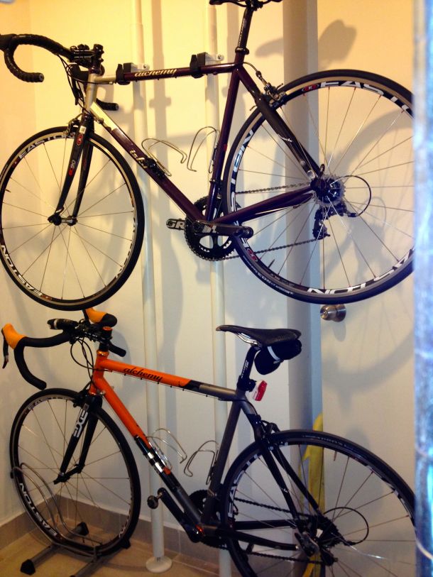The apartments in Kuala Lumpur on our shortlist all had maid’s rooms that could become bicycle rooms.  They all had small maid’s rooms that could become small bicycle rooms.  I have 6 square feet at my disposal.  Once I got my workbench and shelves into the maid’s room I was left with 4 square feet.  That isn’t enough space to have both bikes and myself in the room at the same time.  So for a while I would wheel one bike outside when I wanted to work at the bench.  Biker chick suggested that I rack one bike above the other, and also suggested what to use to do that.  Smart girl.