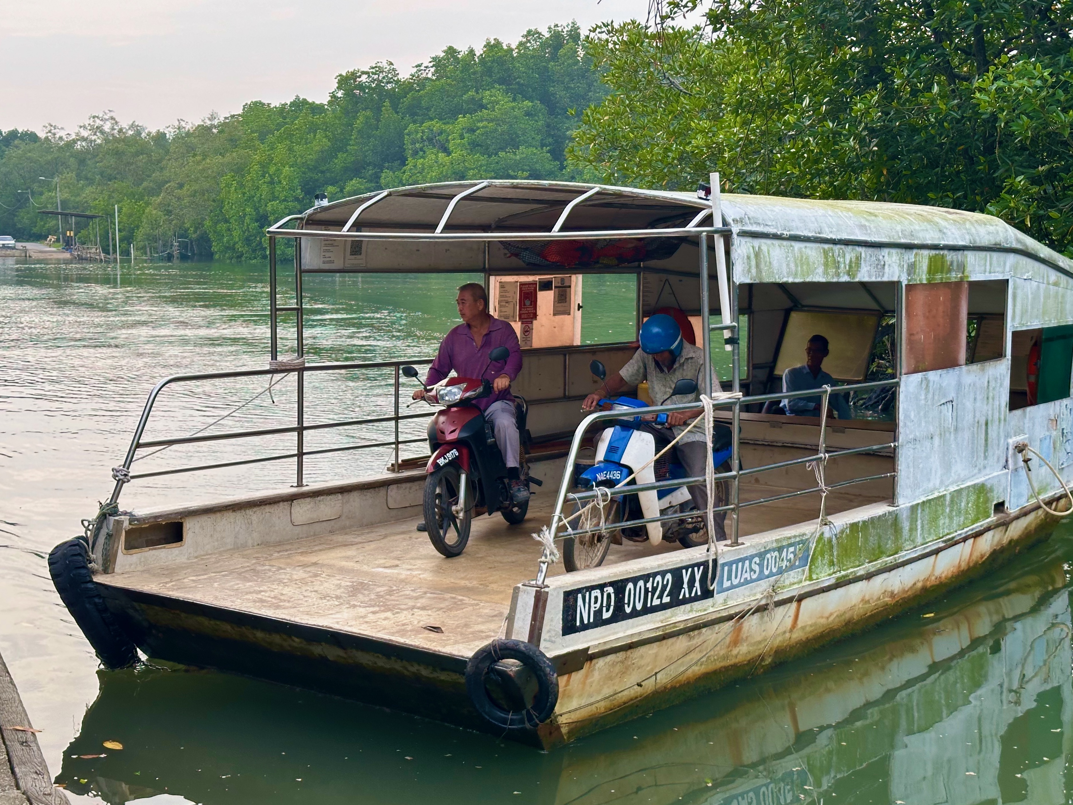 The river at that point is no more than 100 meters wide. The ferry crossing costs RM0.80 / USD0.20 per person, including the RM0.30 / USD0.07 charge for a bike.