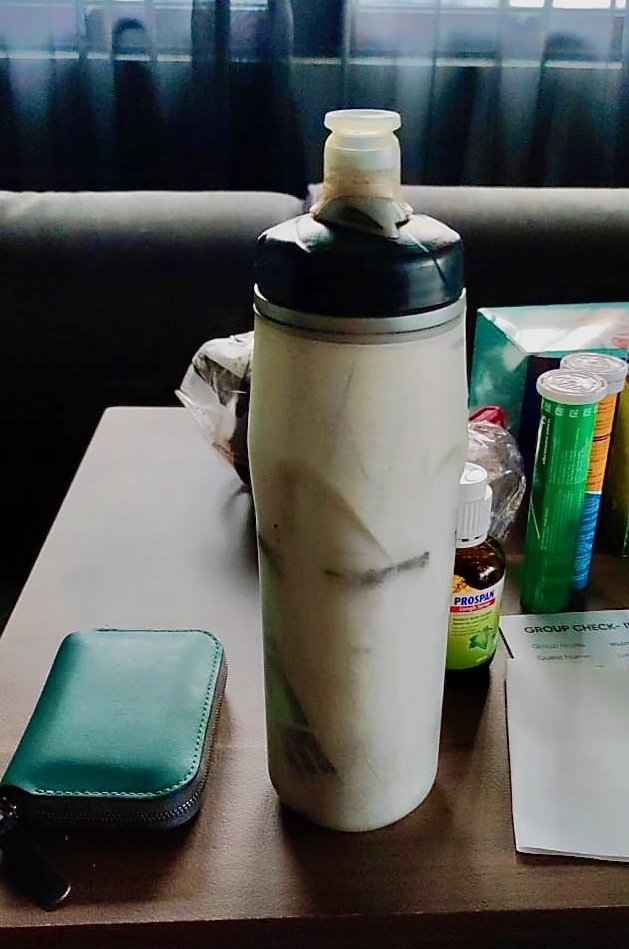 Leslie bought eight packets of drinks. We could only finish one packet each, so we gave the other four packets to the family having a picnic behind us.