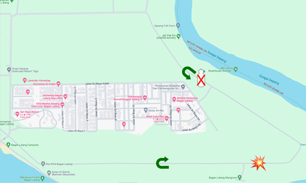 Morib beach is 18km / 11mi from Tanjung Sepat. I sent Mark our live location via WhatsApp. (That is such a cool WhatsApp feature). Simon messaged Mark, suggesting that he and the others start riding and meet us on our way to Morib.
